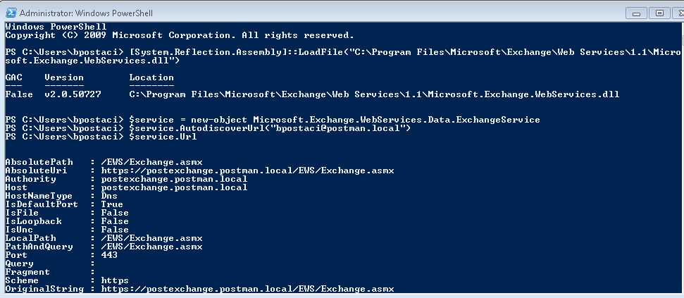 $Service = new-object Microsoft.Exchange.WebServices.Data.ExchangeService $Service.AutoDiscoverUrl(“<EMAIL ADDRESS>”)