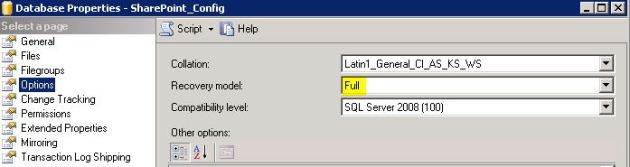 You can check the Recovery mode by using SQL Server Management Studio (SSMS) by selecting “SharePoint Config” database (Right Click)-> Properties -> Options.
