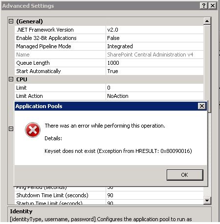 “Keyset does not exists (Exception from HRESULT: 0x80090016)