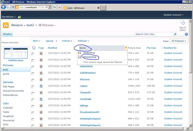 The problem is when you click “Column” links or click popup window Ascending or Descending links nothing happens .Thats mean you can not able to sort items in Picture Libraries.