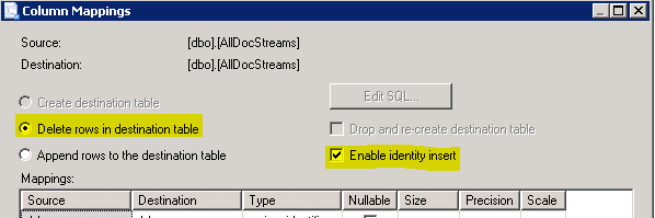 13) Select “Delete Rows in destination table” and select “Enable identity insert” . (Dont forget to do this all selected 5 tables)