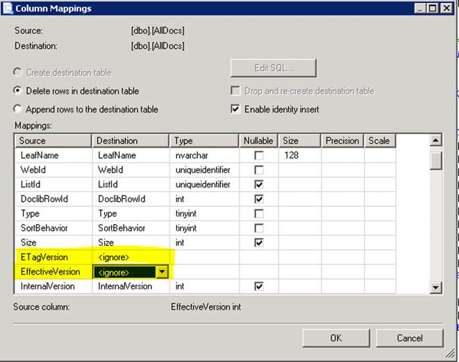 15) For Every Computed Column for every Table you have to select “Destination” value as “<ignore>”