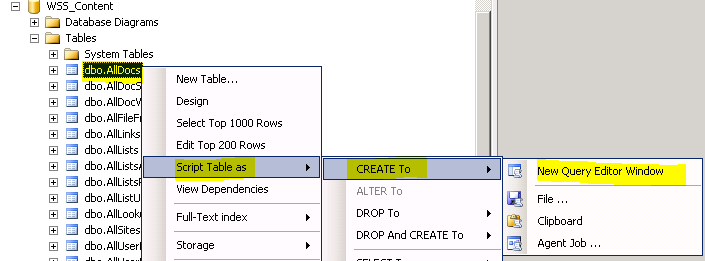 17) Copy all tables’ data to new content database. Check all tables row counts after you finished the operation again.